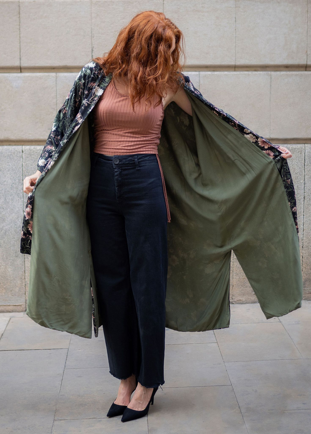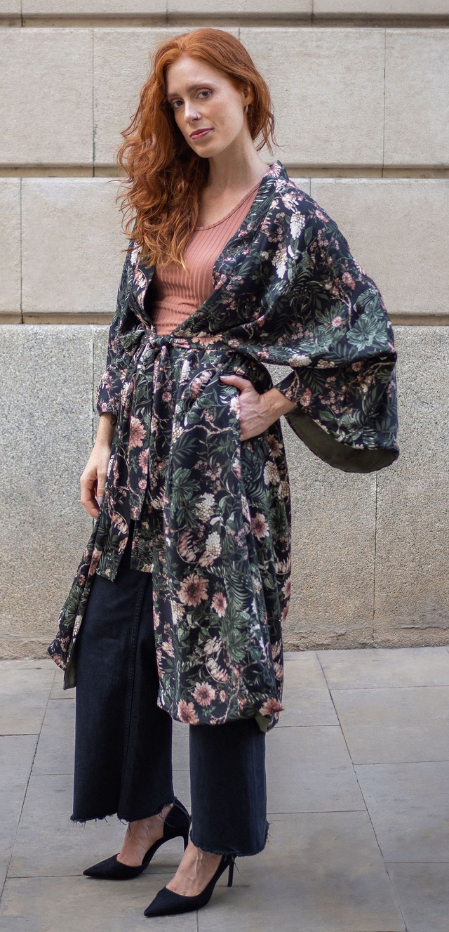 Kimono largo en viscosa estampada con cinturón, bolsillos y forro liso.